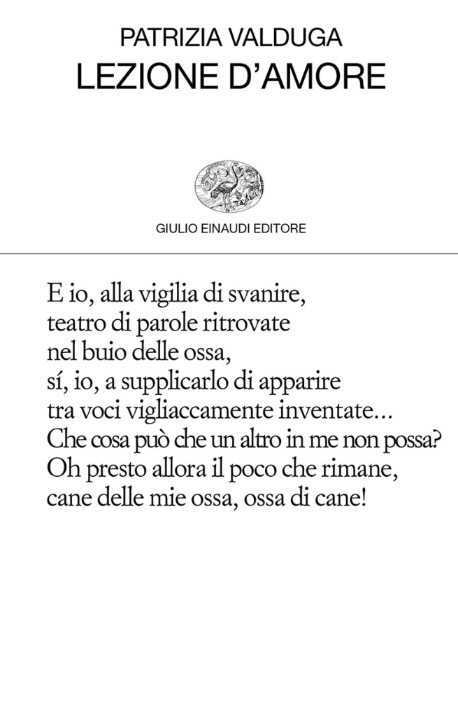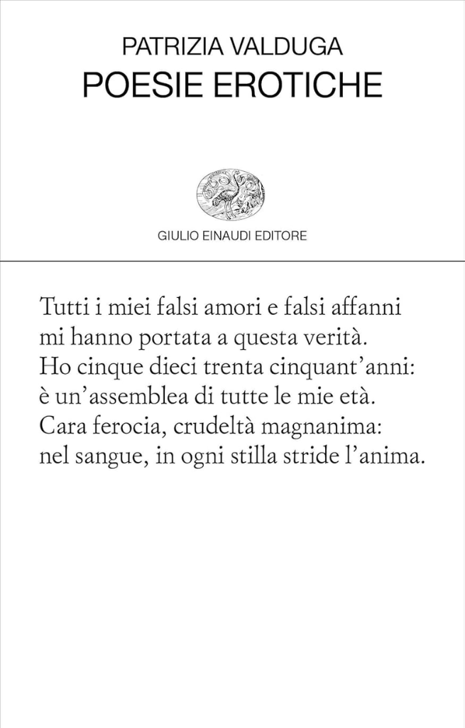 Patrizia Valduga (Castelfranco Veneto, 1953) è poetessa e traduttrice. Per Einaudi ha pubblicato le raccolte di poesia Medicamenta Quartine (2001), Requiem (2002), Lezione d’amore (2004), Il libro delle laudi (2012), Poesie erotiche (2018), Belluno. Andantino e grande fuga (2019), Lacrimae rerum (2025). Ha tradotto opere di Donne, Valéry, Molière, Shakespeare, Pound, Carlo Porta e Sade; in prosa Italiani imparate l’italiano! (2010) e Per sguardi e per parole (2018). Ha curato Breviario proustiano (2011) e Baudelaire (e Flaubert). La carne si fa parola (2021). Nel 1988 ha fondato il mensile Poesia.